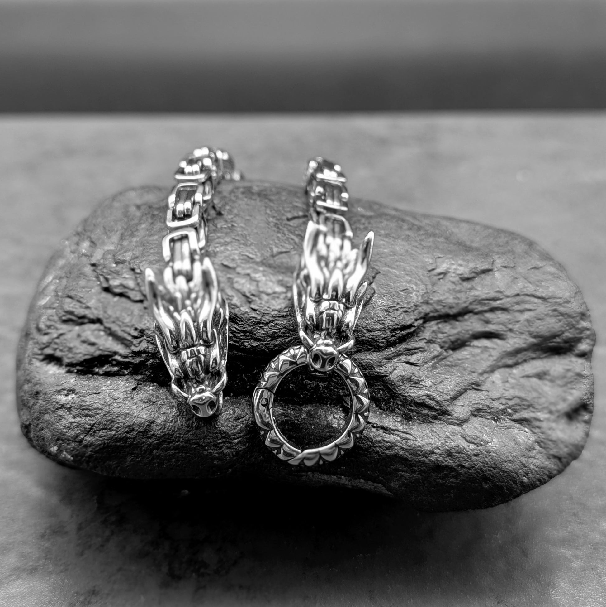Detailed dragon heads with a square byzantine link, strong carabiner clasp.