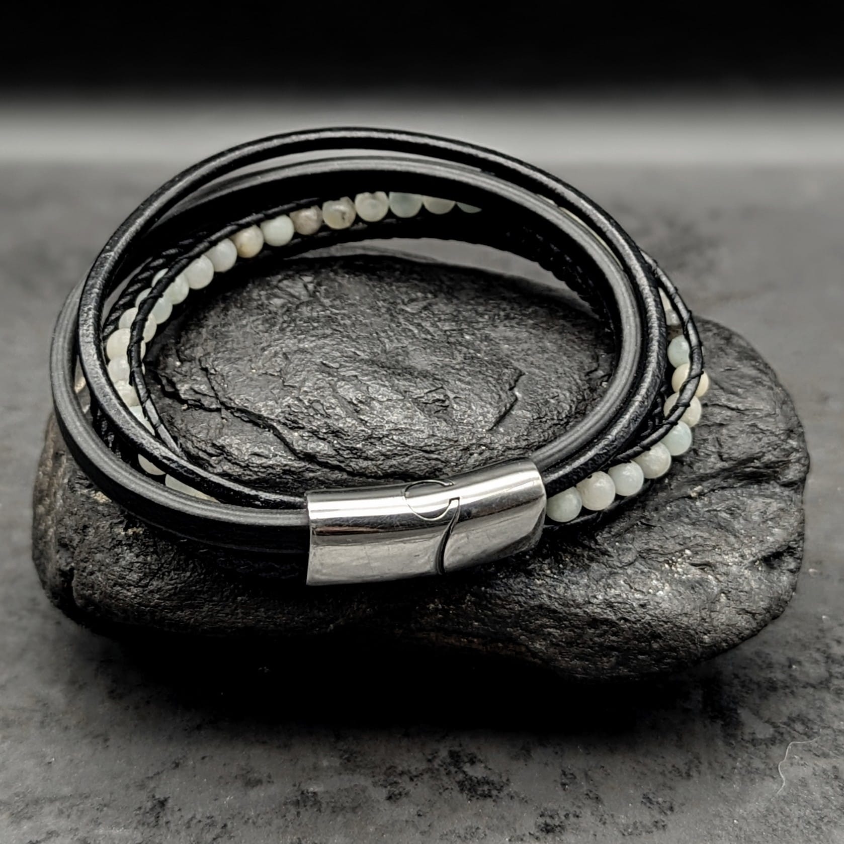 This bracelet features a stylish five strand design, crafted using quality leather and genuine stones. The sliding magnetic closure makes the bracelet easy to wear and secure.